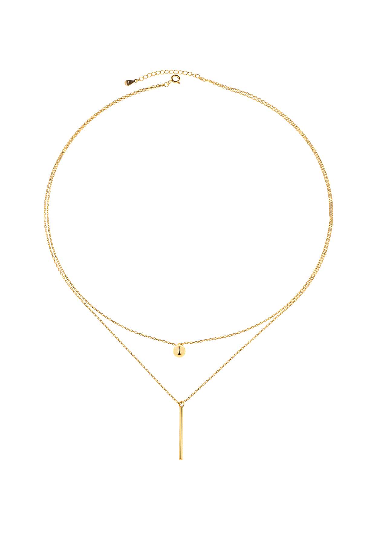 Dwa delikatne łańcuszki ze srebra próby 925 pokryto złoceniem i połączono w harmonijną kompozycję. Górny łańcuszek zdobi mała, gładka blaszka, a dolny kończy się podłużną zawieszką o geometrycznej formie. Kontrast między okrągłym i wydłużonym kształtem tworzy nowoczesny, a zarazem elegancki efekt. Zapięcie z przedłużką pozwala dopasować długość naszyjnika do dekoltu. Całość dobrze układa się na szyi i pasuje do codziennych oraz minimalistycznych stylizacji. Ten model możesz nosić samodzielnie lub zestawić z inną subtelną biżuterią.
